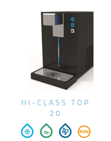 El dispensador de agua Hi-Class Top 20 es recomendado para la operación de cafés o restaurantes. Permite dispensar agua a temperatura ambiente, fria o gasificada.